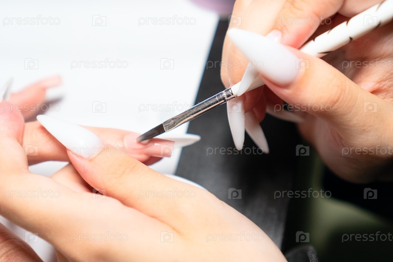 Маникюрщик тщательно выравнивает гелевый лак во время процедуры удлинения, создавая гладкую плоскую поверхность с помощью профессиональной техники