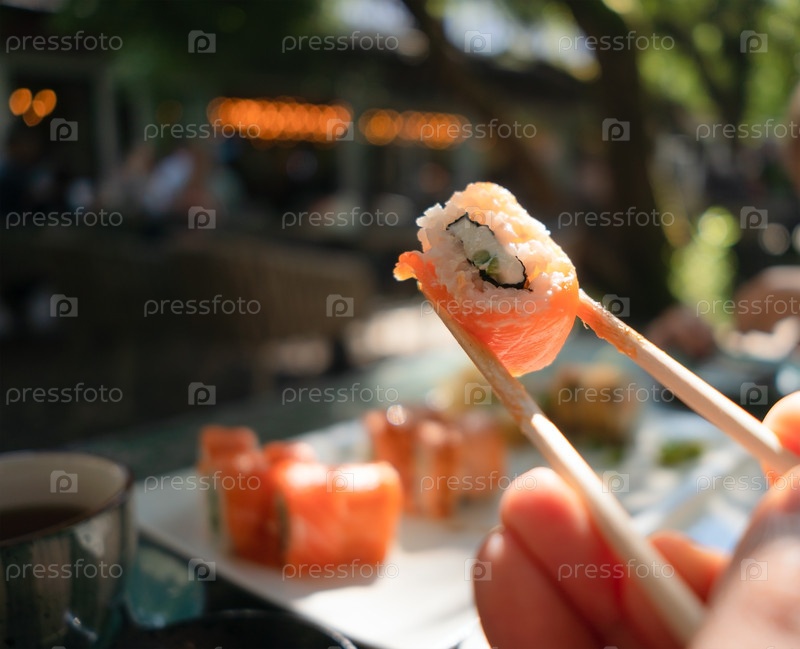 Свежий лосось и огурцовый рулон суши с палочками, красиво представленный подлинной японской кухней на заднем плане