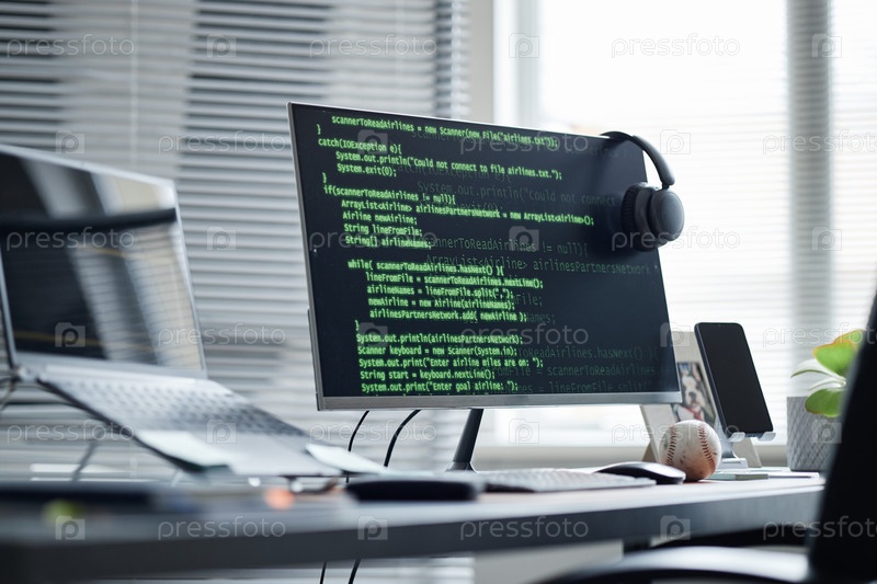 Офисный стол с компьютерным монитором, отображающий современный код программирования