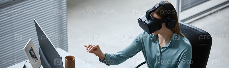 Молодая взрослая женщина использует гарнитуру виртуальной реальности на рабочем столе