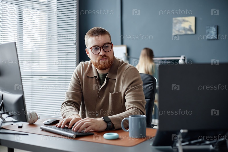 Молодой взрослый мужчина работает на компьютере в современной офисной среде