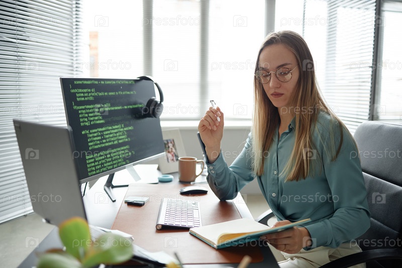 Молодая взрослая женщина пишет заметки, работая на компьютере в офисе