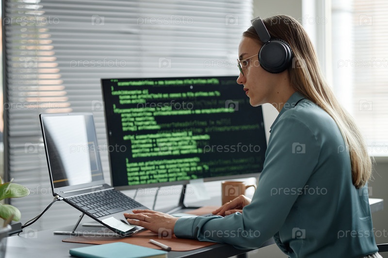Молодая взрослая женщина пишет код на ноутбуке, надевая наушники