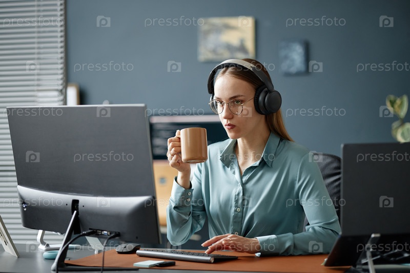 Молодая женщина, которая носит наушники Работает за столом и пьёт кофе