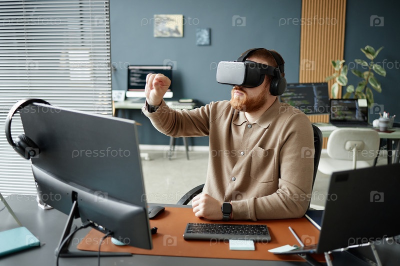 Молодой взрослый мужчина использует гарнитуру виртуальной реальности во время работы