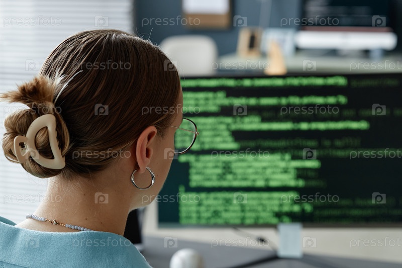 Молодая взрослая женщина работает над компьютерным программированием в офисной обстановке