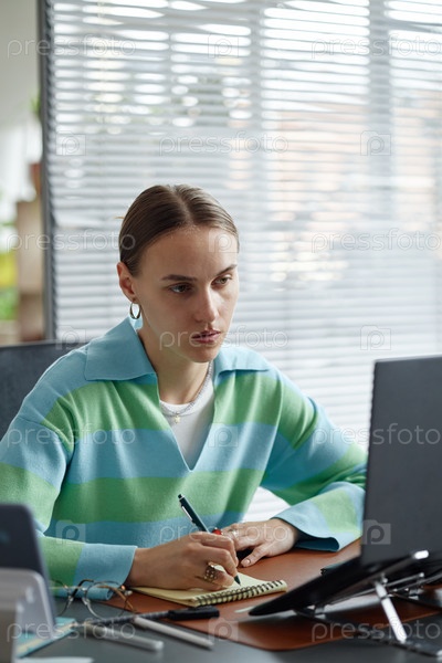 Молодая женщина, работающая удаленно, делает заметки во время онлайн-встречи