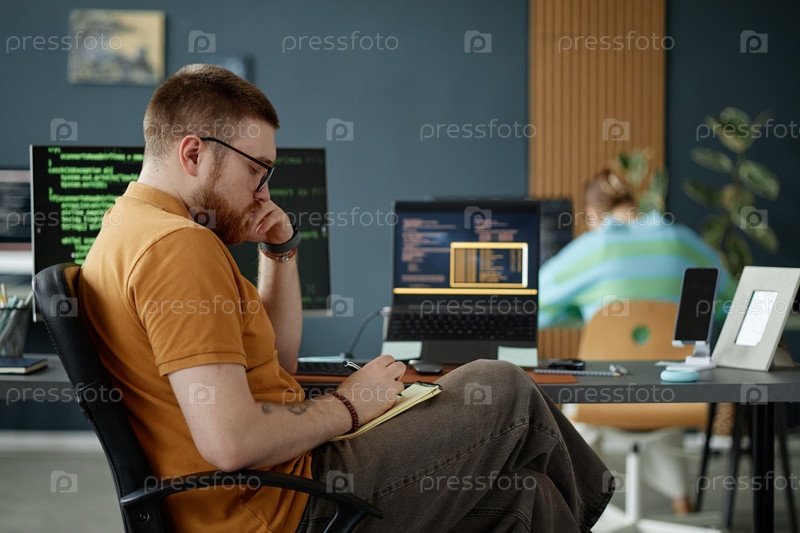 Молодой мужчина, работающий над разработкой программного обеспечения в современном офисе