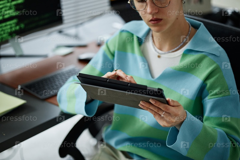 Молодая взрослая женщина использует цифровой планшет во время работы в офисе