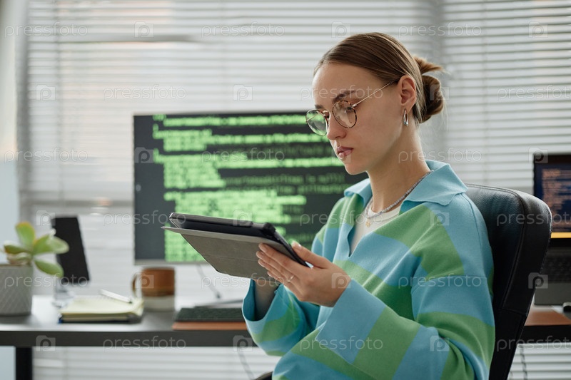 Молодая женщина использует цифровой планшет во время работы в современном офисе