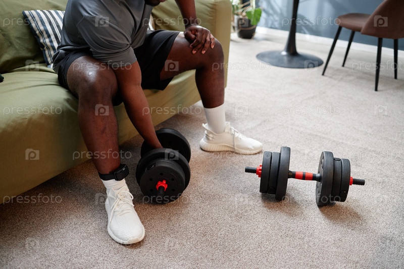 Молодой взрослый чернокожий мужчина, носящий монитор лодыжки упражнения во время домашнего ареста