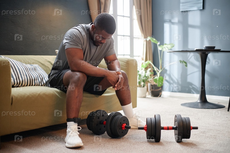 Молодой взрослый чернокожий мужчина сидит в помещении, носящий монитор лодыжки, отражающий