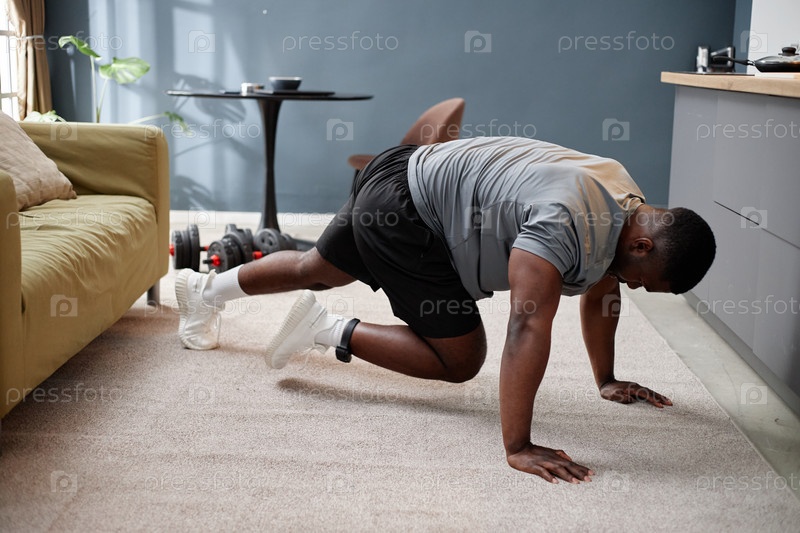 Молодой чернокожий мужчина занимается в помещении, нося электронный монитор лодыжки
