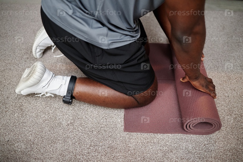 Молодой чернокожий мужчина, носящий монитор лодыжек, встает на колени в помещении во время домашнего ареста