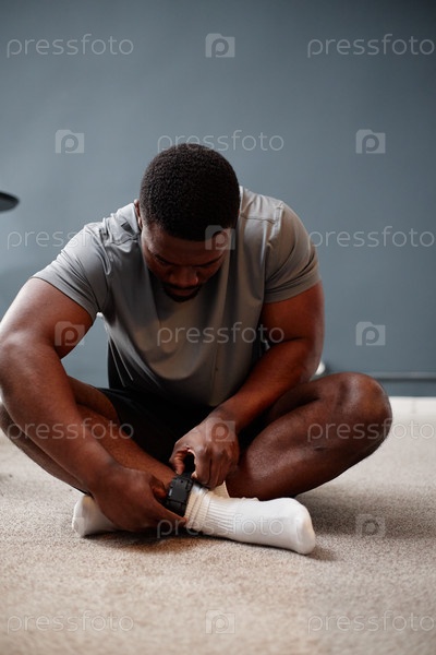 Молодой взрослый чернокожий мужчина сидит в помещении, закрепляя электронный монитор лодыжки