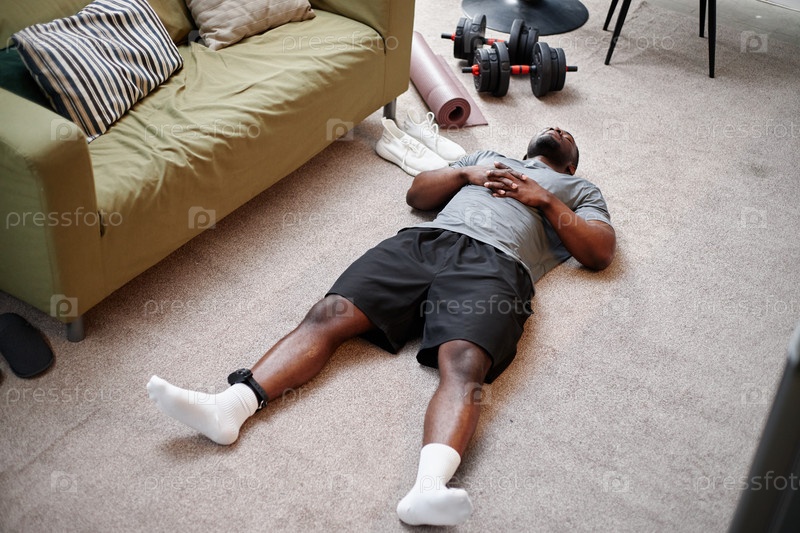 Молодой взрослый чернокожий мужчина с монитором на лодыжке отдыхает в помещении под домашним арестом