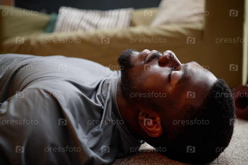 Молодой взрослый чернокожий мужчина лежит в помещении, выдерживая домашний арест с закрытыми глазами