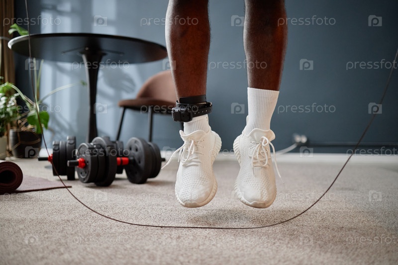 Молодой взрослый чернокожий мужчина занимается в помещении, нося электронный монитор лодыжки