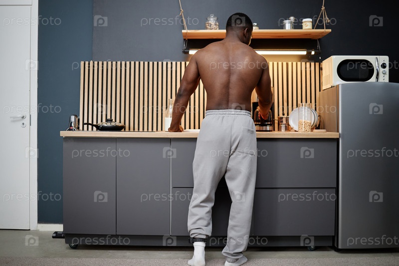 Молодой взрослый чернокожий мужчина стоит в кухоне без рубашки во время домашнего ареста