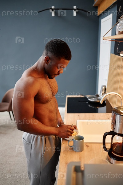 Молодой взрослый чернокожий мужчина готовит напиток на кухне во время домашнего ареста