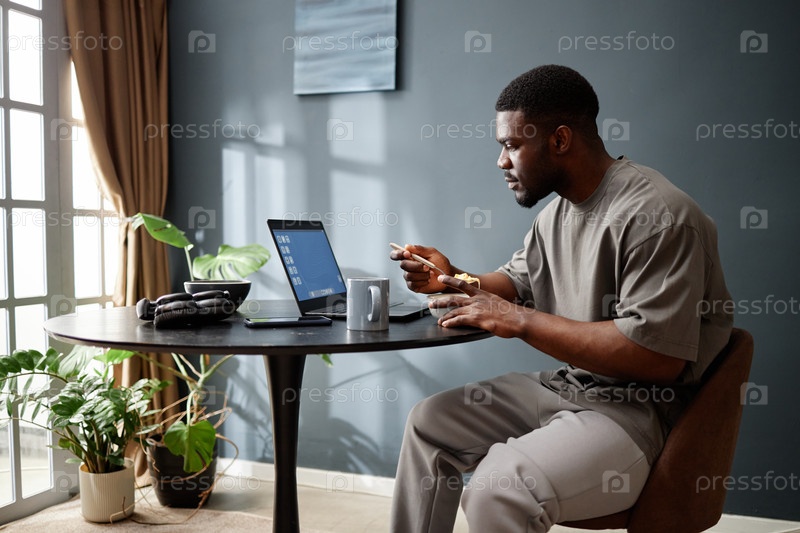 Чернокожий мужчина съедает завтрак, работая на ноутбуке во время домашнего ареста