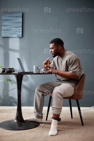Молодой взрослый чернокожий мужчина, носящий монитор лодыжки, работающий удаленно во время домашнего ареста