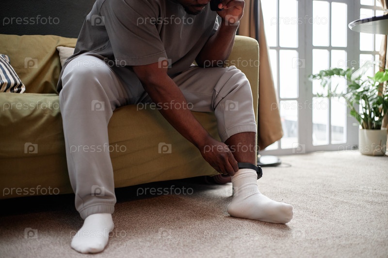 Молодой взрослый чернокожий мужчина сидит в помещении, проверяет устройство электронного монитора лодыжки