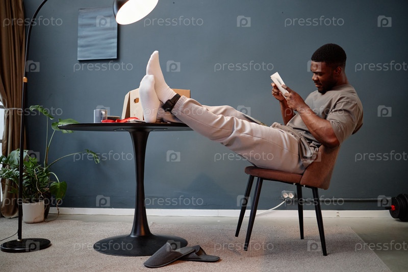 Молодой взрослый чернокожий мужчина читает книгу, сидя дома во время домашнего ареста