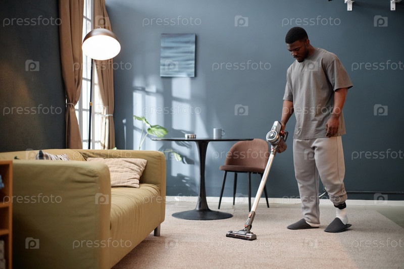 Молодой чернокожий мужчина пылесосит ковер в гостиной во время домашнего ареста дома