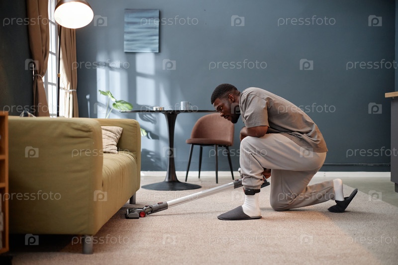 Взрослый чернокожий мужчина, носящий монитор лодыжки Уборка гостиной во время домашнего ареста