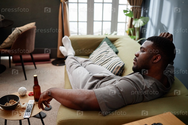 Молодой взрослый чернокожий мужчина отдыхает на диване во время домашнего ареста с монитором лодыжки