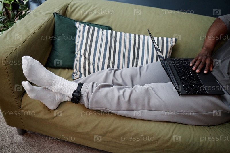 Чернокожий мужчина среднего возраста, носящий монитор лодыжки с помощью ноутбука во время домашнего ареста