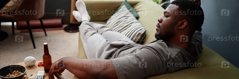 Header Image of Young Adult Black Man Relaxing during House Arrest on Sofa Заголовок изображения молодого чернокожего мужчины, расслабляющегося во время домашнего ареста на диване
