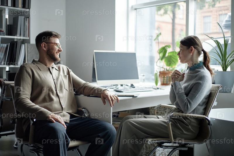 Молодой человек разговаривает с молодой женщиной в современном офисе