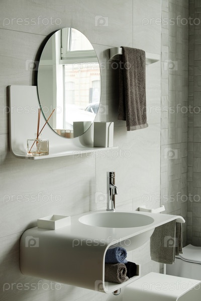 Современный интерьер ванной с минималистической раковиной и дизайном круглого зеркала