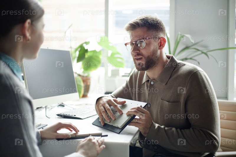 Молодой взрослый мужчина, держащий образец консультирующая женщина в шоу-зале