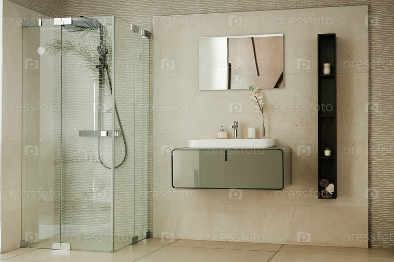 Современный интерьер ванной с стеклянным душем и минималистической зоной раковины