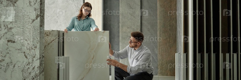 Молодая женщина и молодой мужчина изучают образцы мраморных плиток