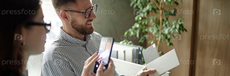 Молодой взрослый мужчина улыбается, в то время как коллега фотографирует образцы
