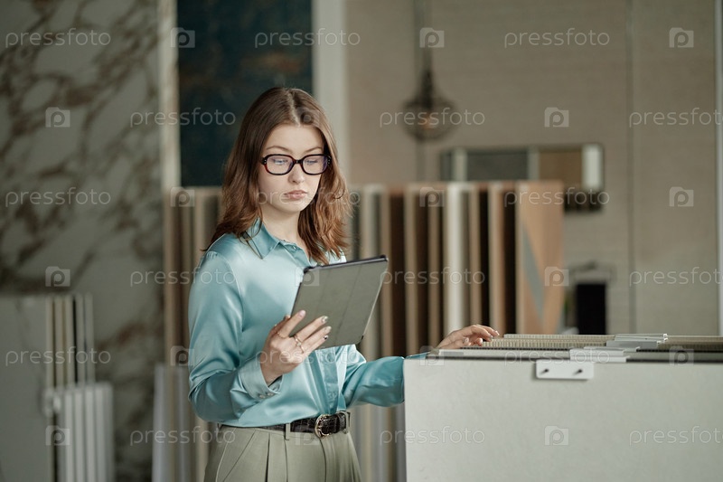 Молодая женщина использует цифровой планшет во время работы в современном офисе
