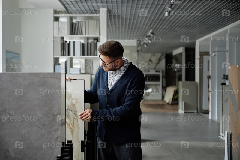 Молодой взрослый мужчина изучает мраморные плиты в современной выставочной комнате