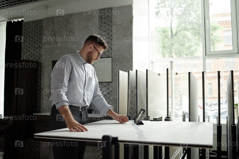 Человек, изучающий архитектурные планы в современном офисе