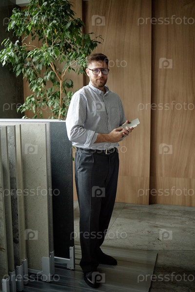 Стоящий в помещении, держащий образцы и ожидающий человека