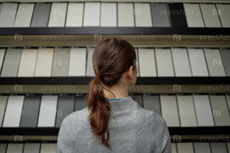 Молодая женщина, стоящая в помещении и обращенная к стене, демонстрирует образцы плитки