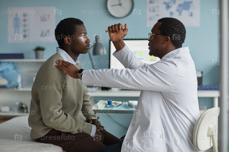 Молодой чернокожий человек проходит осмотр глаз мужчиной-черным врачом в клинике