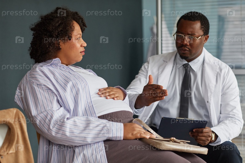Беременная чернокожая женщина консультируется с чёрным мужским врачом во время пренатальной встречи
