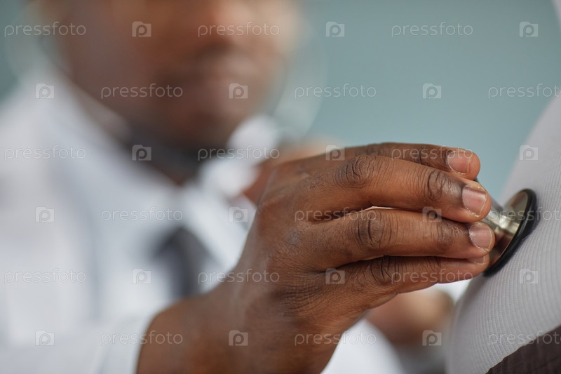 Чернокожий мужчина средних лет с помощью стетоскопа осматривает пациента в клинике
