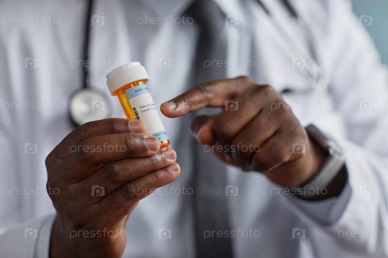 Черный мужчина Доктор, держащий бутылку с лекарственными препаратами по рецепту Объяснение использования