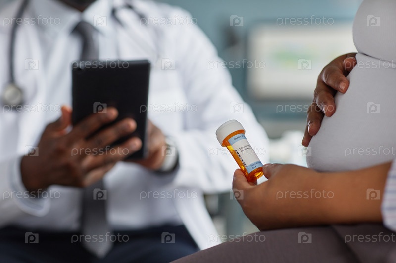 Беременная чернокожая женщина держит бутылку с рецептом Консультации с врачом