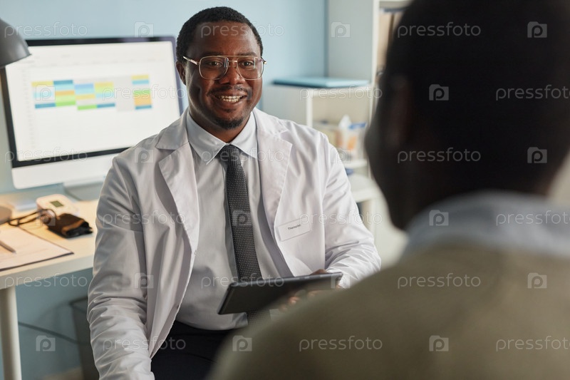 Чернокожий мужчина средних лет Доктор улыбается, консультируя пациента в кабинете